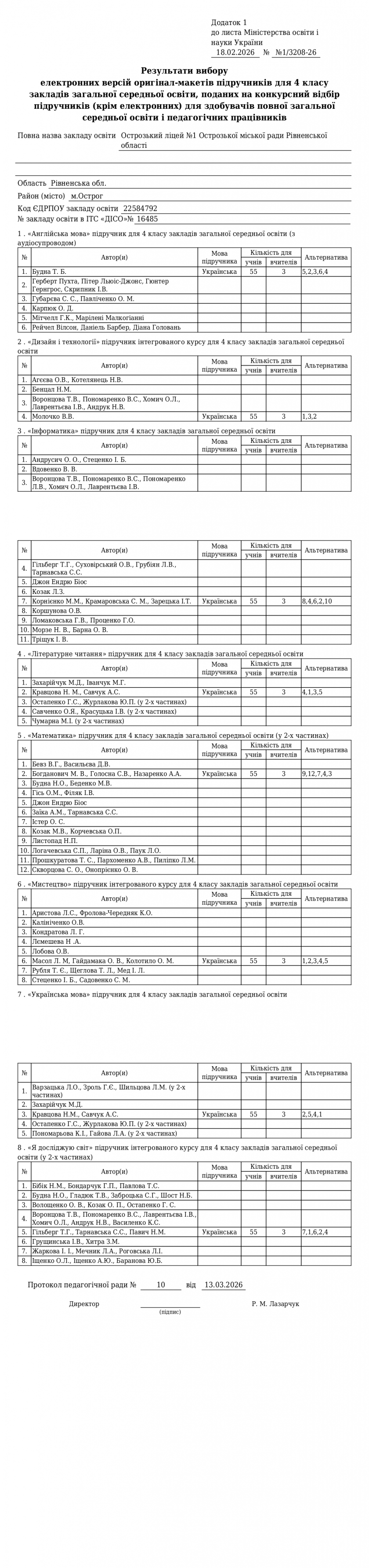 Результати вибору електронних версій оригінал-макетів підручників для 4 класу закладів загальної середньої освіти, поданих на конкурсний відбір підручників (крім електронних) для здобувачів повної загальної середньої освіти і педагогічних працівників