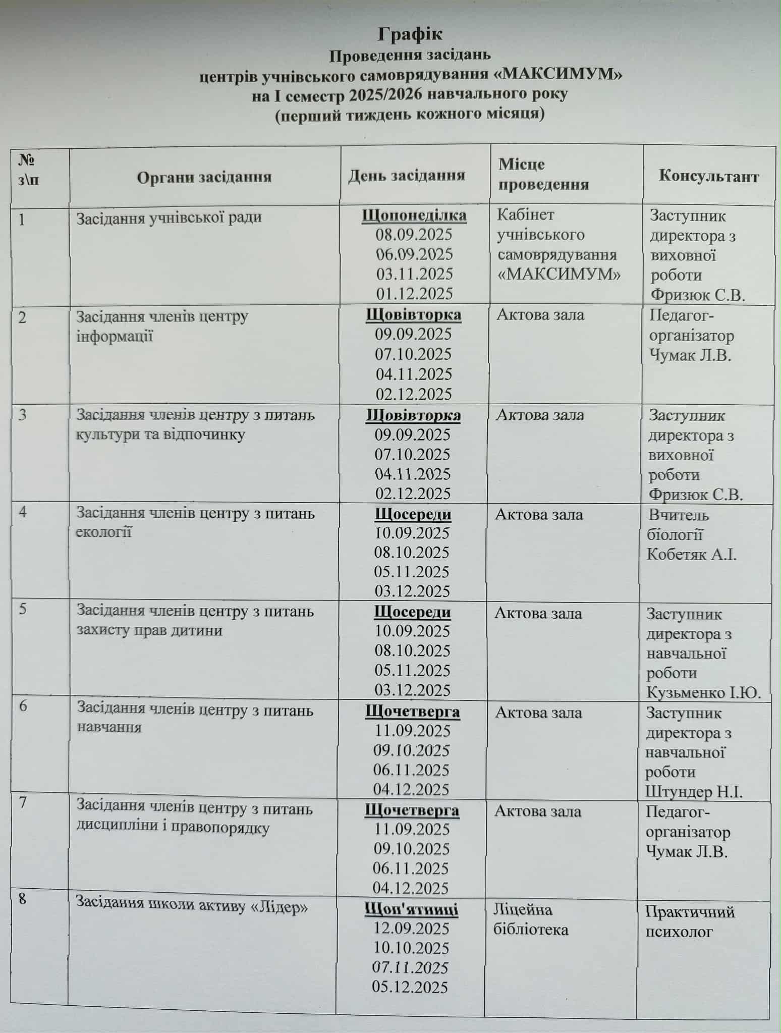 Наш ліцей – маленький світ, маленька держава, де ми не лише навчаємось, але й відпочиваємо, вчимося жити, формуємося як майбутнє нашої України. І тому у нас створено центр учнівського самоврядування «МАКСИМУМ», в межах діяльності якого кожен бажаючий може себе виразити, проявити. Щороку ми обираємо президента центру, який бере на себе зобов’язання захищати права учнів, відстоювати наші інтереси перед вчителями, адміністрацією. Президент обирає голів центрів, виносить їхні кандидатури на обговорення учнівської ради. Коли голів центрів обрано, у кожному класі обираються представники центрів і починається злагоджена робота. Центр інформації бере участь у підготовці радіопередач та публікації інформації про проведені заходи на сторінках ліцею в соціальних мережах. Центр культури та відпочинку займається організацією свят, вечорів відпочинку, спортивних змагань. Центр з питань навчання стежить за успішністю, центр з питань дисципліни та правопорядку – за хорошим мікрокліматом у ліцеї, центр з питань захисту прав дитини допомагає скривдженим, а центр з питань екології робить наш ліцей зеленим і чистим. Але це ще не все. Є у нас унікальний центр – школа активу «Лідер», на засіданнях якої можна навчитися бути справжнім керівником. Співпраця з практичним психологом, з учителями допомагає членам школи активу долучатися до ліцейного життя, вносити свої пропозиції, тобто вчитися бути лідерами. Нам усім подобається працювати тут, бо разом ми молоде, активне, кмітливе, самостійне, виховане, майстерне, українське майбутнє (саме так розшифровуємо ми слово «максимум»)