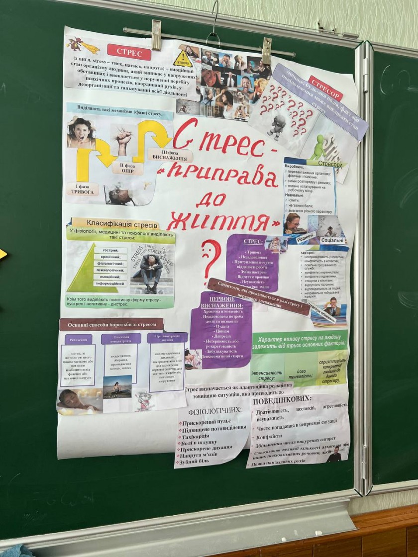 Стрес має різні причини, але індивідуальні прояви, про які варто знати, щоб попередити сам стрес і його негативні наслідки на здоров’я людини. Саме з цією метою в нашому ліцеї для учнів 11-х класів вчителем біології Т. Дячук, за допомоги психологічної служби ліцею, проведено тренінгові заняття з тем «Стрес – приправа життя» та «Знаємо про стрес та долаємо його». У ході занять учні поглибили свої знання про стресори та антистресори, дізнались про «корисний» та «шкідливий» стрес, виробили навички заземлення та ознайомились зі способами зменшення негативного впливу стресових факторів. Шляхом тестування визначили наскільки стресостійкими вони є. Також вивчили правила суджок терапії, які можна легко та ефективно використати як швидку допомогу при знятті напруги під час написання НМТ. Бережіть себе.