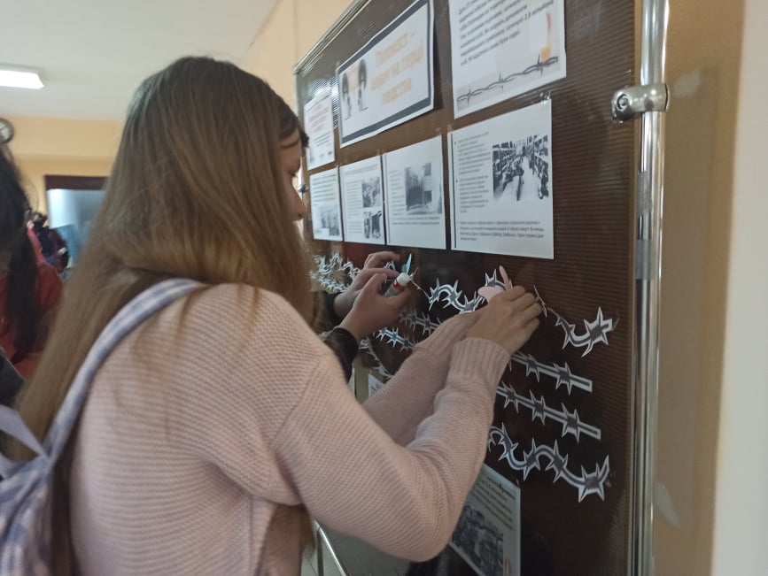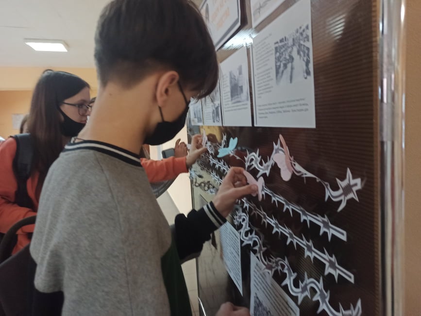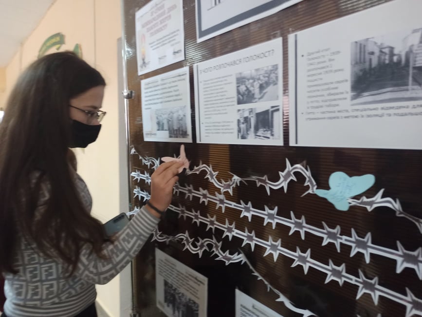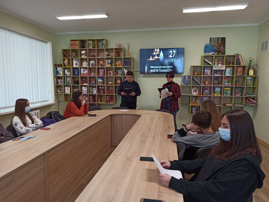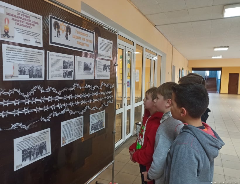 Трагедія Голокосту - це урок для всього людства. У цей день, День скорботи і пам’яті, учні приєдналися до загальної печалі, ім’я якої Голокост. Педагогом-організатором Чумак Л.В., спільно з учителем історії Бойко Р.Ю., для учнів 9 класів проведено урок-реквієм «Гірка пам'ять Голокосту». Школярі не лише пригадали подробиці цих страшних подій, але й долучилися до акції пам`яті «В гетто метелики не живуть…». Впродовж дня для школярів діяв інформаційний стенд «Трагедія Голокосту в Україні».