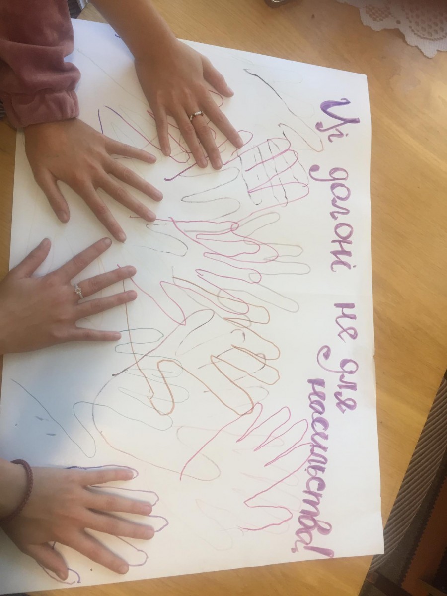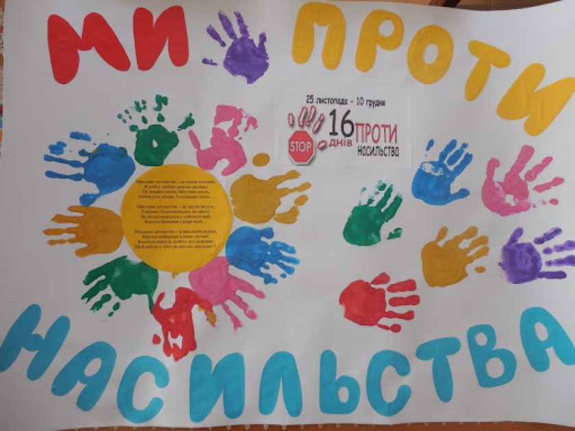 Під час проведення акції «16 днів проти насильства» соціальним педагогом було організовано заняття з елементами тренінгу для учнів 6,7 класів «Ми проти насильства!». Проведений захід спонукав дітей до аналізу власних дій та вчинків, сприяв вихованню людяності, відповідальності, поваги до гідності інших людей.