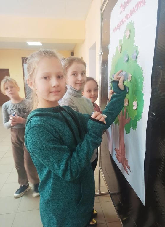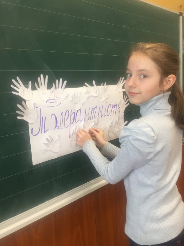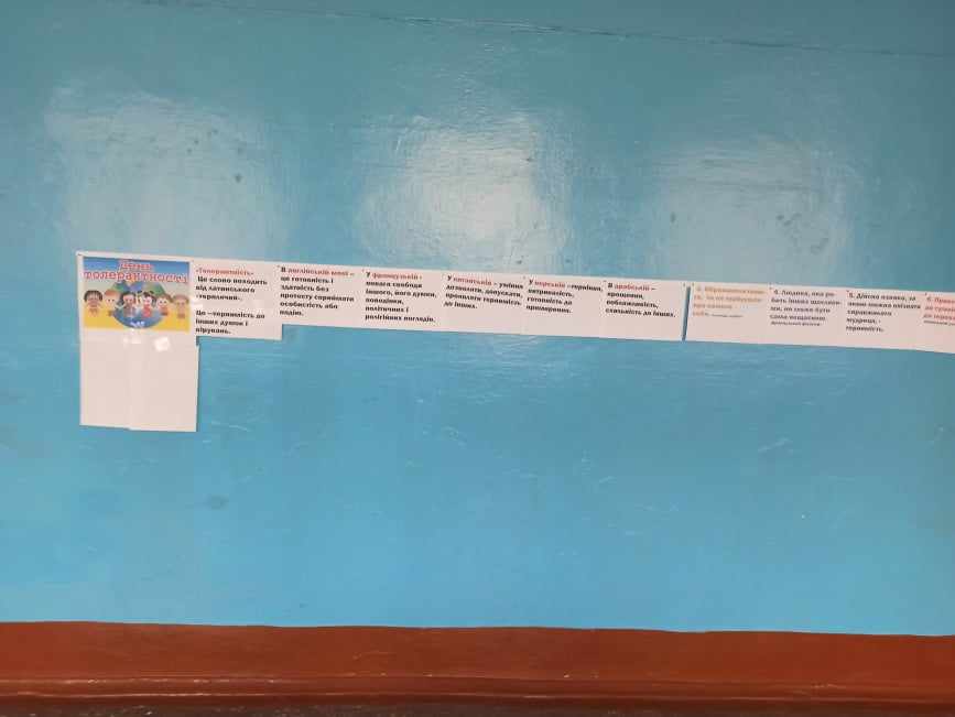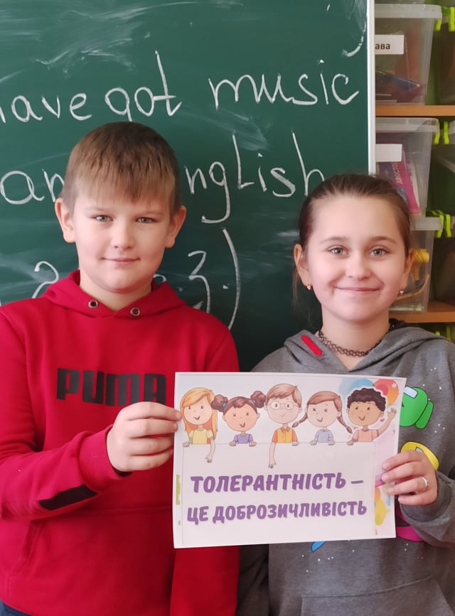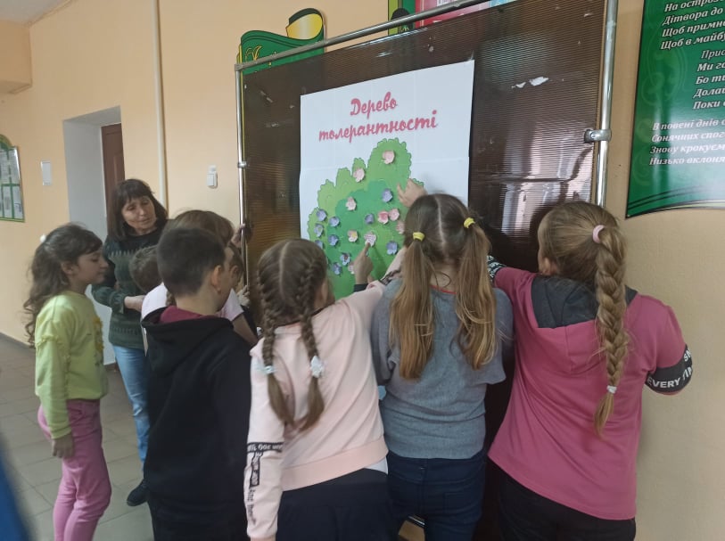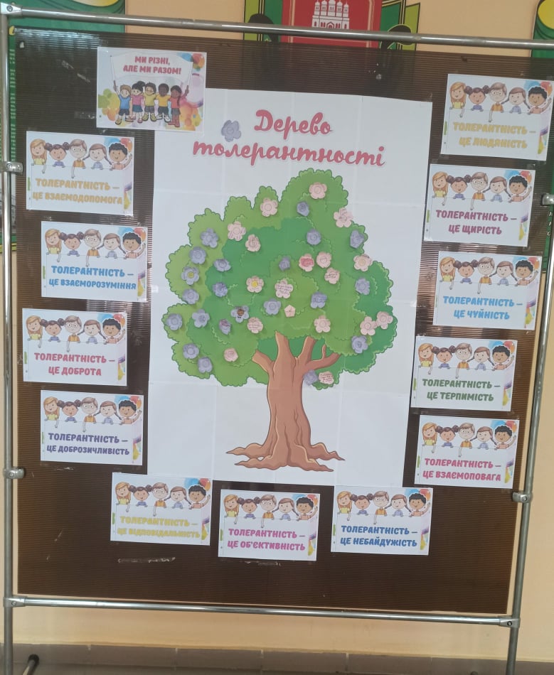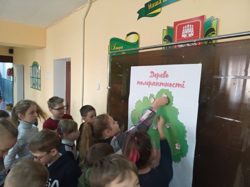 Педагог організатор Чумак Л.В. провела бесіду «Ми - різні, але ми – рівні» для учнів 3-4 класів. Учасники освітнього процесу виготовили «Дерево толерантності». Соціальним педагогом Салюк Л.П. разом із учнями 4-А класу було проведено заняття з елементами тренінгу «Толерантність - крок до гуманності». Під час якого діти визначили риси толерантної людини та людини, яка проявляє гідність, пропрацювали проблемні ситуації в групах. Наприкінці заняття діти дійшли висновку, що толерантність починається із себе. Також учні долучилися до фоточеленджу «Толерантність - …». Загалом проведені заходи формували в учнів загальнолюдські моральні цінності, поширювали серед шкільної спільноти принципи терпимості, сприяли налагодження толерантних взаємин між учасниками навчального процесу.