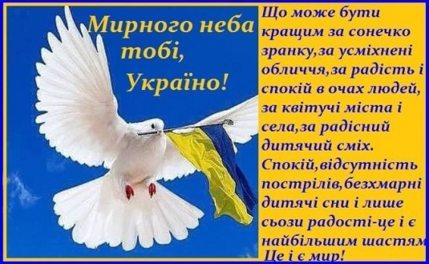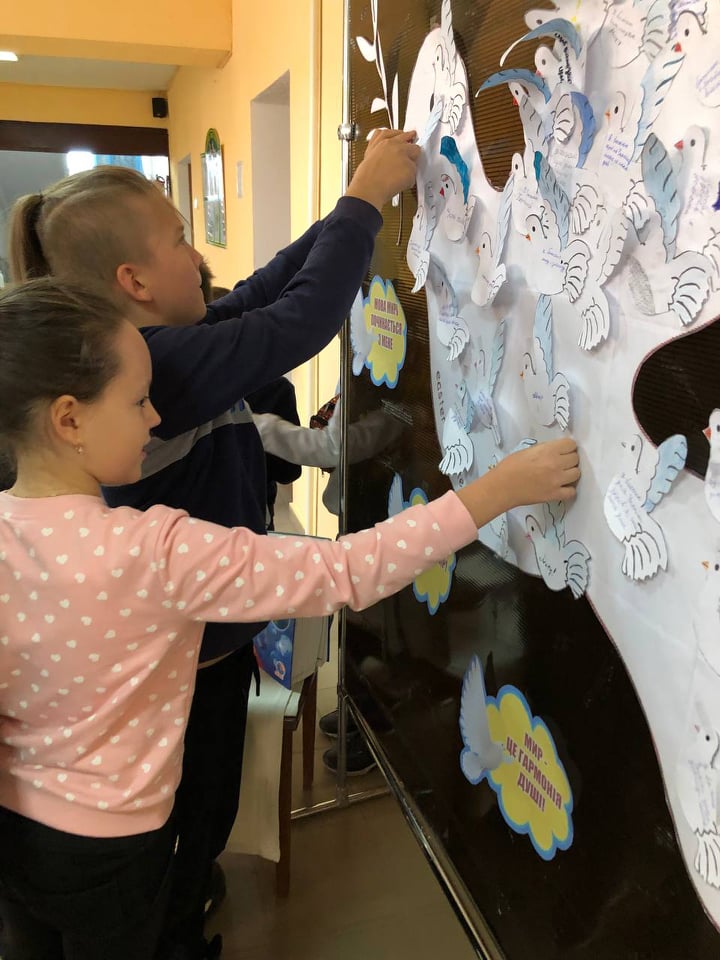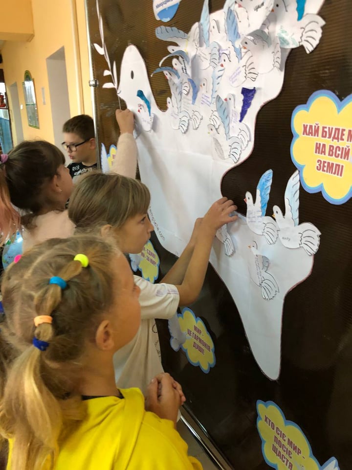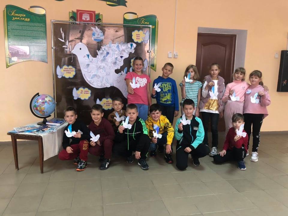 Найбільше у світі щастя – це мир, коли люди живуть дружно та спокійно, земля не здригається від страшних вибухів, не ллються сльози горя та втрат. Щорічно 21 вересня в Україні та світі відзначають Міжнародний день Миру. З нагоди свята Членами учнівського самоврядування «МАКСИМУМ» проведено радіогазету «21 вересня - Міжнародний день миру». Учнівський та педагогічний колективи нашої школи долучилися до акції «Ми віддаємо свій голос за МИР». Класними керівниками проведено бесіди: «Ми за мир у всьому світі», «День миру», «Мир-це гармонія душі», «Мова миру починається з мене» та інші. Також олодші школярі приєдналися до Всеукраїнської акції «Голуб миру». Учні виготовили паперових голубів як символ єднання всіх людей Землі у прагненні миру.