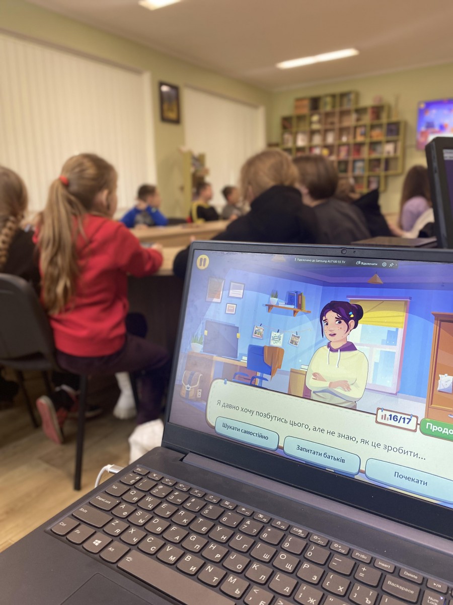 «КРОК» - це гра з протидії насильству, яка створена на основі методів казкотерапії. У ній моделюються ситуації, з якими можуть зустрічатися діти та підлітки у повсякденному житті. Учні вчилися розпізнавати небезпечні ситуації та будували алгоритми дій у них.
