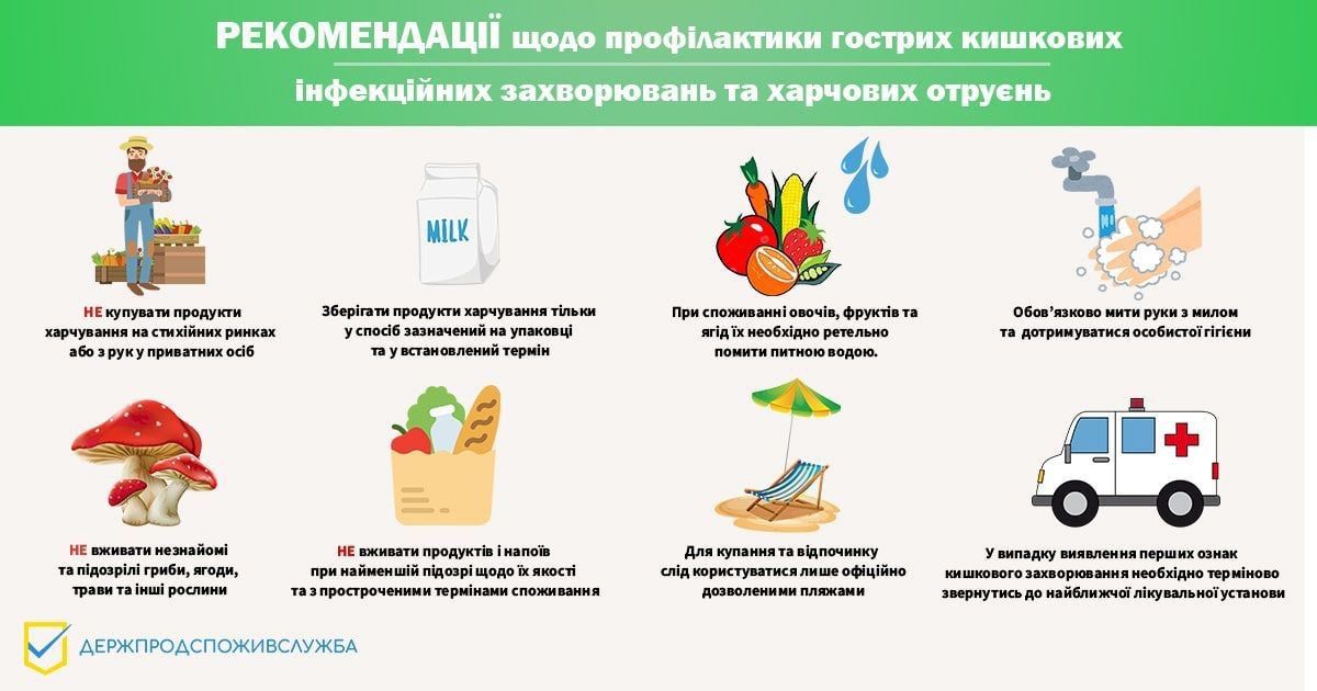 Щоб уберегтися від харчових отруєнь і гострих кишкових інфекцій, вживайте лише ті продукти, у якості яких ви впевнені, дотримуйтеся 5 кроків до безпечнішої їжі, купайтеся у чистих водоймах і обирайте лише офіційно відкриті для відпочинку пляжі та рекреаційні зони.