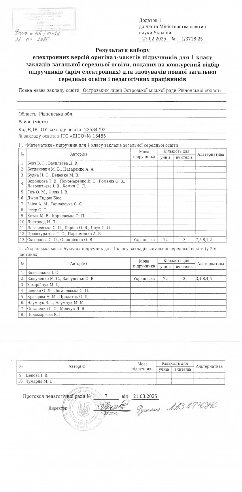 Результати вибору електронних версій оригінал-макетів підручників для 1 класу закладів загальної середньої освіти, поданих на конкурсний відбір підручників (крім електронних) для здобувачів повної загальної середньої освіти і педагогічних працівників