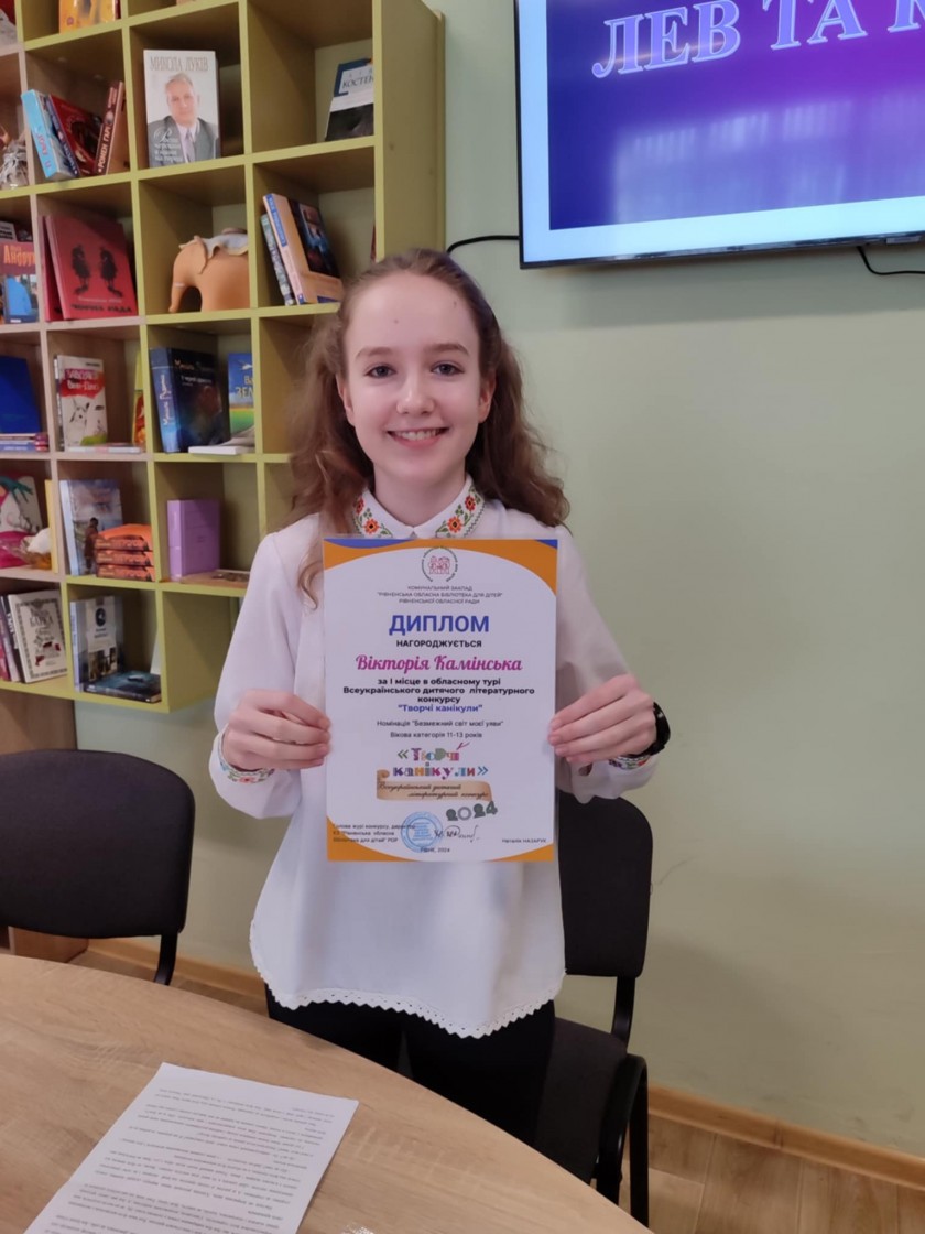 23 січня 2025 року в бібліотеці Острозького ліцею №1 організовано творчу зустріч з юною письменницею Вікторією Камінською, яка стала переможницею обласного етапу Всеукраїнського дитячого літературного конкурсу «Творчі канікули» у номінації «Безмежний світ моєї фантазії».