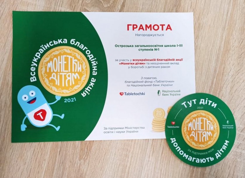 Поспішаємо поділитися з вами гарною новиною! У вересні Острозька ЗОШ І-ІІІ ступенів №1 долучилася до благодійної Всеукраїнської акції "Монетки дітям", що проводилася за ініціативи та підтримки Національного банку України, з постійним партнером АТ "Ощадбанк" - благодійний фонд " Таблеточки" на допомогу онкохворим дітям.