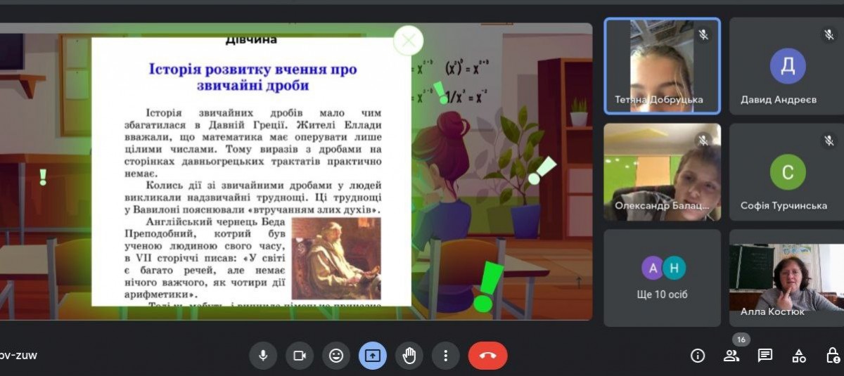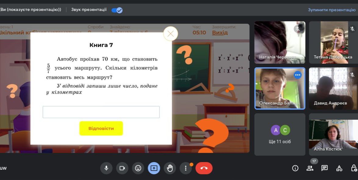 Вчителями-предметниками на уроках проводились математичні 5-хвилинки "Чи знаєте ви ...". Учні 6-их класів віртуально подорожували країною «Звичайних дробів». Учні 5-В та 5-А класів разом із вчителем математики Барановською О.А. грали математично-інтелектуальну гру про натуральні числа «ФАКТ чи ФЕЙК?». Учні 5-Б мали можливість разом із своїм вчителем Курач І.М. зіграти онлайн-гру «Еврика». Садовська І.І. разом із учнями 7-А та 7-Б класів провели квест «Мандруємо країною Геометрії», а Кордиш Т.Г. разом із 7-В мали можливість за допомогою квесту «Цікава математика» пізнати багато цікавого із предмету. Учні 8-их класів відвідали віртуальний концерт «Число p - музика Всесвіту».