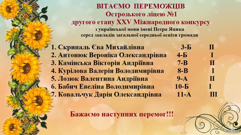 Вітаємо переможців другого етапу XXV Міжнародного конкурсу з української мови імені Петра Яцика