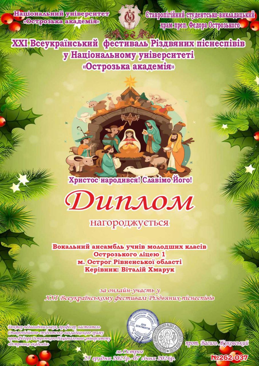 Також ансамбль став учасником ХХІ Всеукраїнському фестивалі Різдвяних піснеспівів у Національному університеті "Острозька акадедемія". Бажаємо учням та їх наставнику перемоги в територіальному етапі конкурсу.