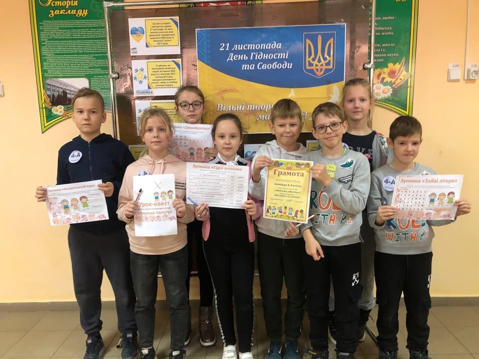 День Гідності та Свободи — це свято в Україні, що відзначається щороку 21 листопада на честь початку цього дня двох революцій: Помаранчевої революції (2004 року) та Революції Гідності (2013 року). 3 метою утвердження ідеалів свободи і демократії, вшанування патріотизму і мужності українців, які стали на захист прав і свобод людини і громадянина, національних інтересів Українського народу, в нашій школі були проведені тематичні заходи. Педагогом-організатором оформлено інформаційний стенд «21 листопада-День Гідності та свободи». Учні 4 класів стали активними учасниками квест-гри «Людська гідність», яку для них організували члени учнівського самоврядування «МАКСИМУМ». Класними керівниками були проведені тематичні бесіди на теми: «Річниця Гідності та Свободи», “Герої, які змінили хід історії”, «З Україною в серці», «Вільні творити майбутнє» та інші.