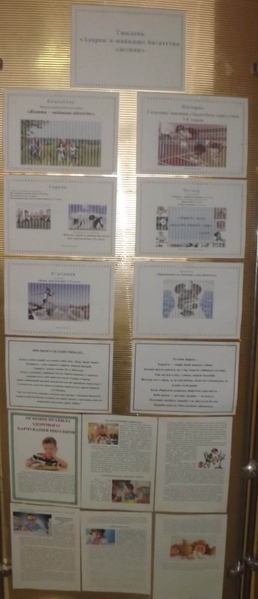 З метою формування позитивної мотивації на здоровий спосіб життя, профілактики ВІЛ/СНІДу, виховання бережливого ставлення до свого здоров’я, до особистої гігієни, до власного життя, у школі з 15 по 19 січня 2018 року проходив тиждень «Здоров’я - найвище багатство людини!». Розпочався тиждень радіогазетою «Життя - найвища цінність» та оформленням інформаційного стенду «Харчування за змінених умов довкілля». Учні 7-8 класів взяли участь у спортивних змаганнях з баскетболу (вчителі фізичної культури Борчаковський Д.В. Шимчук С.А.) Практичним психологом Зінчуком Т.О. та соціальним педагогом Гопанчук В.В. організовано заняття з елементами тренінгу на теми: «Ваш вибір» (9 класи), «Я буду здоровим» (7-8 класи) та години психолога для учнів 5-6 класів «Здоров’я – запорука життя». Вчителями біології проведено науково-практичну конференцію «Фізичне здоров’я людини та шляхи його забезпечення» (8 класи) та фітнес для головного мозку на теми: «Як позбутися поганих думок» (9 класи); «Як жити весело» (7 класи); «Як планувати мрії, щоб не мати депресій» (11 класи). У шкільній бібліотеці відбулася зустріч учнів 9-А класу з кандидатом медичних наук, лікарем Острозької психоневрологічної лікарні Загороднім Сергієм Михайловичем «Спокус у житті багато». Також в рамках тижня центром учнівського самоврядування «МАКСИМУМ» організовано випуск інформаційний листівок «За здоровий спосіб життя». Упродовж тижня діяла галерея висловів про здоров’я та літературна реклама «Здорові звички зарифмуй – своє майбутнє спроектуй». У шкільній бібліотеці створено постійно діючу виставку літератури «Здоров’я – запорука краси і сили», яка постійно оновлюється. Класними керівниками 1-11 класів проведено години спілкування на теми «Що я маю знати, щоб зберегти своє здоров’я?», «Якщо хочеш бути здоровим – загартовуйся!», «Правила здорового способу життя», «Моє здоров’я – найбільший скарб», «Шкідливі звички – ворог людини», «У здоровому тілі здоровий дух», «Бережи – здоров’я змолоду», «Якщо хочеш бути здоровим – загартовуйся!», «Правила здорового способу життя», «Моє здоров’я – найбільший скарб», «Шкідливі звички – ворог людини», «У здоровому тілі здоровий дух», «Здоров’я – запорука краси і сили» та інші.